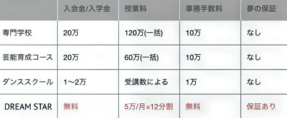 専門学校や某有名タレント育成コース、ダンススクール等と、このDREAM STAR DANCE PROJECTの料金比較表